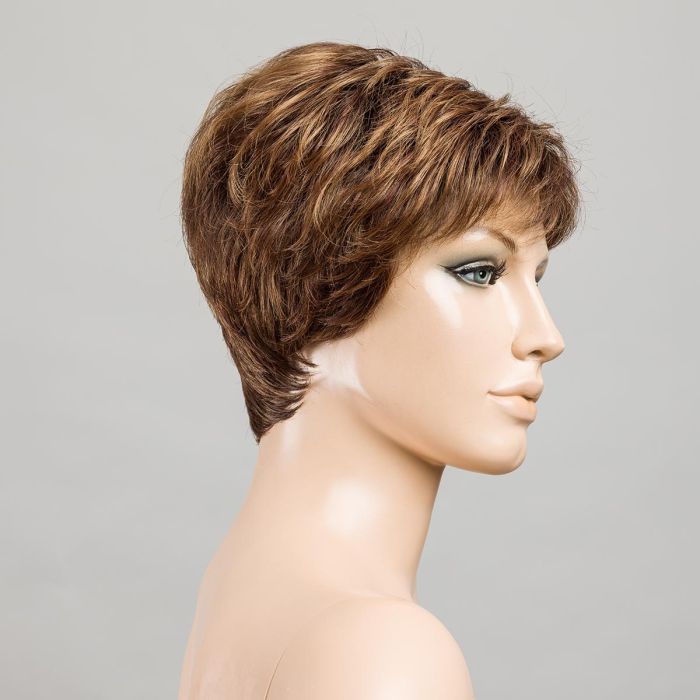 This type of cap features a wonderfully natural crown or “crest” area, where each and every hair has been individually weaved. This area varies on all models, depending on the style, it is usually either pointed or elongated. The wig looks particularly natural in areas where the skin is visible, as the weave of wig hair appears to flow directly from your own scalp, just like natural hair growth. The rest of this wig mostly consists of a wefted cap in which the hair is sewn into fine cotton tapes. Wefted caps adapt very well to the shape of the head and allow air to circulate.